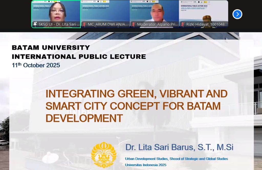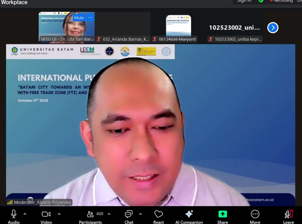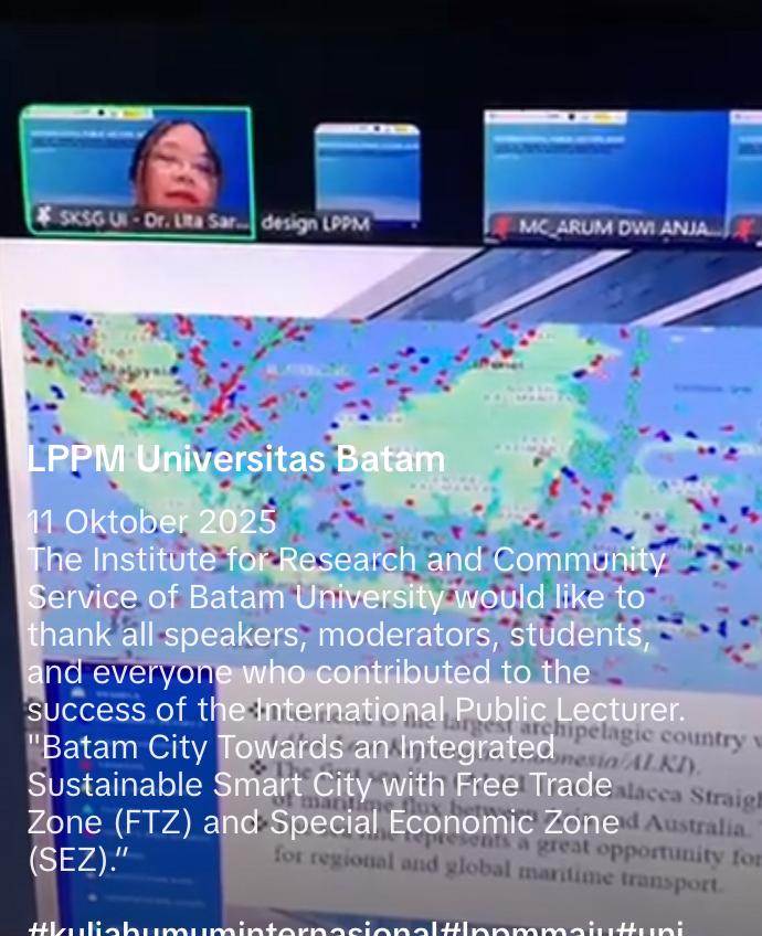 BATAM, 11 Oktober 2025 — Universitas Batam (UNIBA) melalui Lembaga Penelitian dan Pengabdian kepada Masyarakat (LPPM) menyelenggarakan International Public Lecture bertajuk “Batam City Towards an Integrated Sustainable Smart City with Free Trade Zone (FTZ) and Special Economic Zone (SEZ)” secara daring melalui platform Zoom Meeting.
