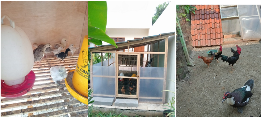 Memelihara ayam di kota juga realistis—lahan 2×2 meter cukup untuk sekitar 5 ekor (1 jantan, 2 leghorn petelur, 2 ayam kampung). Pada umur ±6 bulan, ayam mulai bertelur dan berkembang biak, sehingga keluarga dapat memanen telur secara berkala. Sisa makanan dapur bisa dimanfaatkan untuk pakan dan kompos. Dengan mencampur daun kering, sisa makanan, dan kotoran ayam, kandang tetap tidak berbau. Hasilnya, komunitas berpotensi memanen sayuran, telur, daging ayam, sekaligus kompos untuk pupuk.