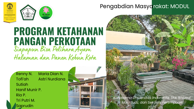 Jakarta, 19 Oktober 2025 — Program Studi Kajian Pengembangan Perkotaan Sekolah Pascasarjana Pembangunan Berkelanjutan (SPPB)/Graduate School of Sustainable Development (GSSD) Universitas Indonesia menyelenggarakan seminar pada 19 Oktober 2025 sebagai puncak rangkaian kegiatan pengabdian kepada masyarakat (pengmas). Aksi ini mengajak warga kota memperkuat ketahanan pangan keluarga melalui berkebun dan memelihara ayam di halaman rumah. Acara berlangsung di Taman Pendidikan Al-Qur’an (TPA) Ikhlasul Machfudz, Lenteng Agung, Jakarta Selatan.